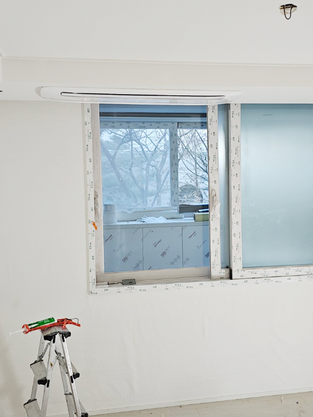 앞서 가장 먼저 보여드릴 공간은 위 사진과 같이 칸막이가 설치될 예정인 거실입니다. 전문가의 사전 방문을 통해 거실에 가벽 설치 예정이라는 안내를 전달 받고 한 개의 넓은 공간이 아닌 따로 분리되어있는 공간으로 시스템에어컨 설계를 진행하였습니다.