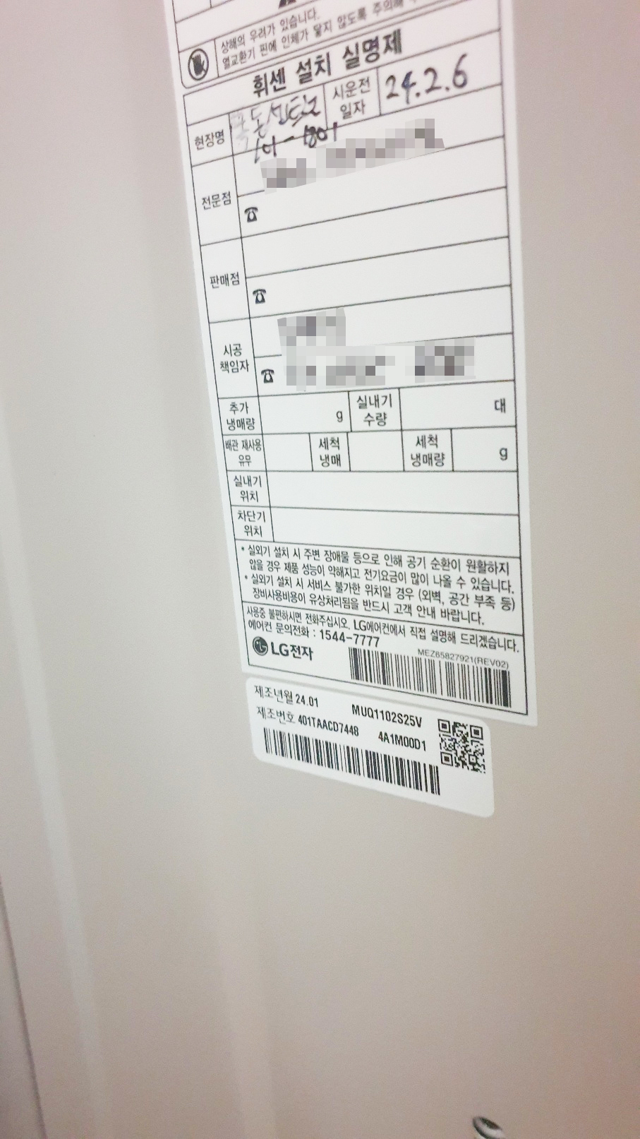 실내기와 실외기의 배관을 연결한 뒤, 물이 빠지는 배관은 베란다의 배수구를 통하여 빠져나갈 수 있도록 시공하였고 에어컨 전용 차단기 설치 및 전력 공급을 마치고 나면 모든 시공이 마무리가 됩니다. 마지막 작업인 시스템에어컨 시공 하자 예방을 위한 점검과 LG 시스템에어컨 설치 실명제 스티커를 실외기 측면에 부착하고 마무리를 짓습니다.